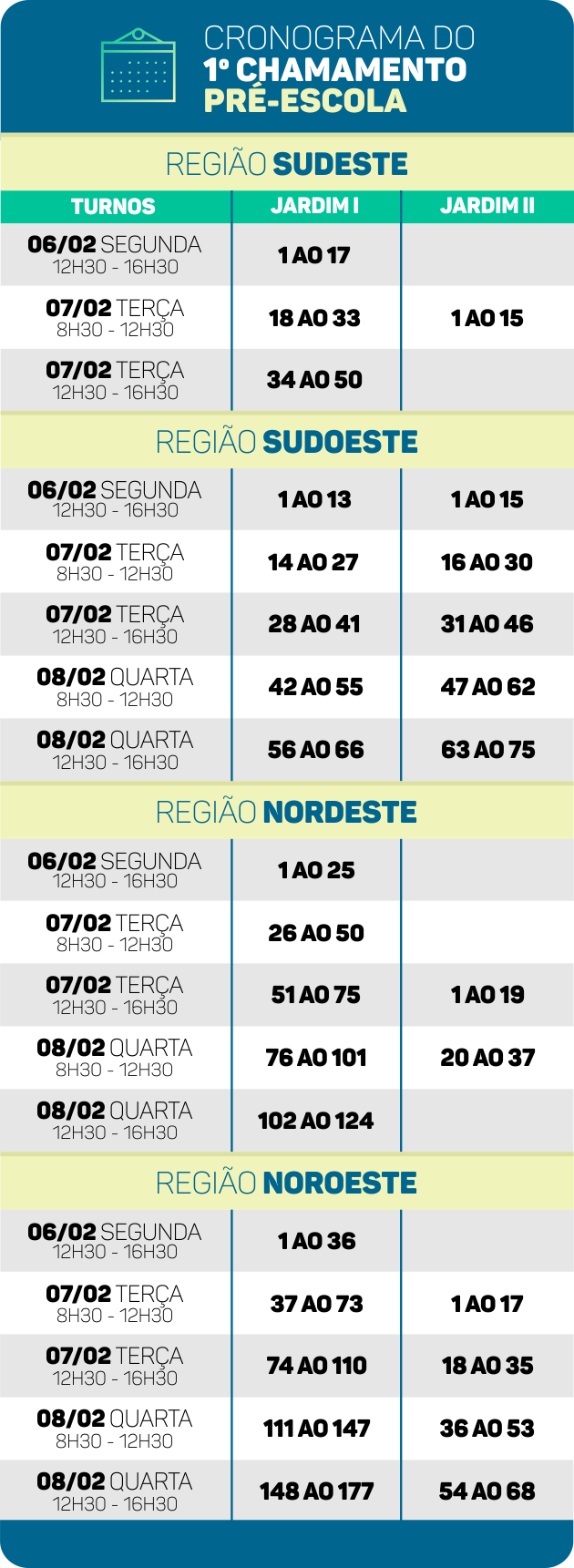 A secretaria da Educação iniciou nesta quarta-feira, 1º, o primeiro chamamento da pré-escola, para turmas de Jardim 1 e 2, de crianças entre 4 e 6 anos. Por meio de telegrama, e-mail e telefonema, os pais e responsáveis foram informados da data, do local e do horário em que devem comparecer à subprefeitura da sua região para realizar a escolha de escola, dentre as mais próximas da sua casa (a lista com todas as informações necessárias estão nas tabelas abaixo).